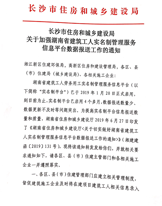 關(guān)于加強(qiáng)湖南省建筑工人實(shí)名制管理服務(wù)信息平臺(tái)數(shù)據(jù)報(bào)送工作的通知